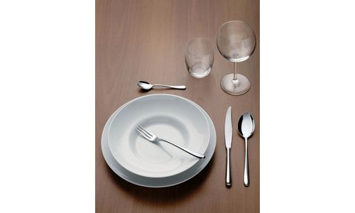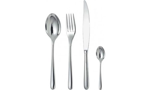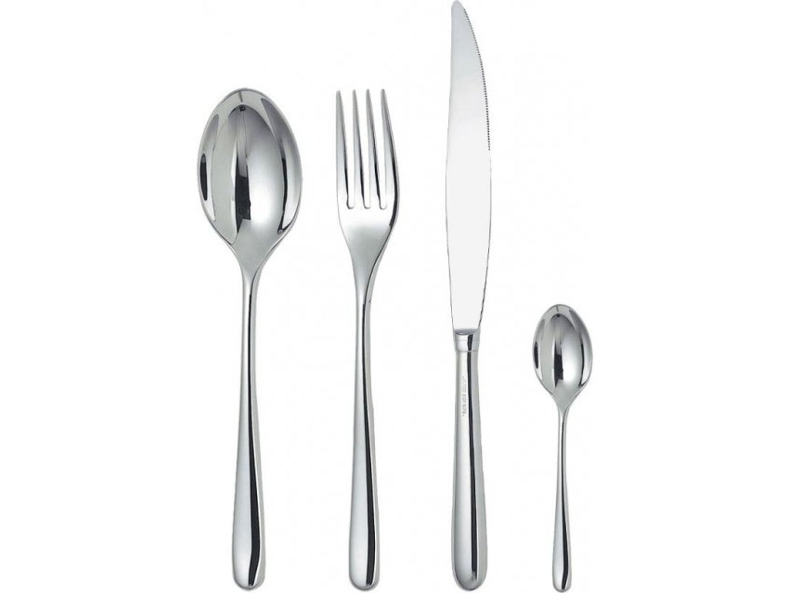 Bestekset bestaande uit zes eetlepels, zes tafelvorken, (met vier tanden), zes tafelmessen, zes theelepels in 18/10 roestvrijstalen gepolijste spiegel.
