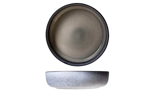 Een nieuwe serviescollectie die bijzonder opvalt door de verschillende aspecten: de combinatie mat en blinkend, het samenspel tussen craquelé en spikkels, en ook nog een kleurcombinatie die geaccentueerd wordt door een zwarte contour rond de kuil en rond de rand van het bord.