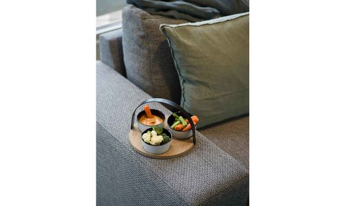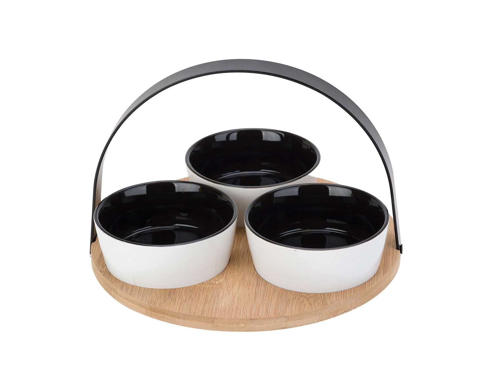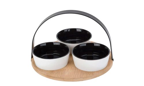 Tapasset Bamboe Plank D20cm Rond 3 Bowls 10x4cm Zwart Wit - Metalen Handle