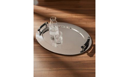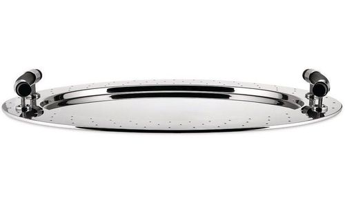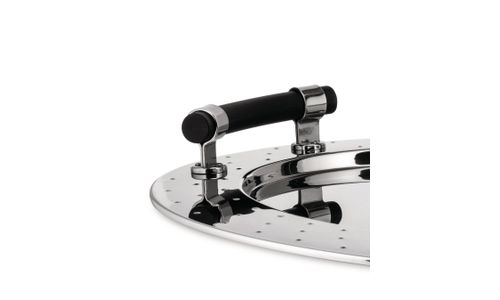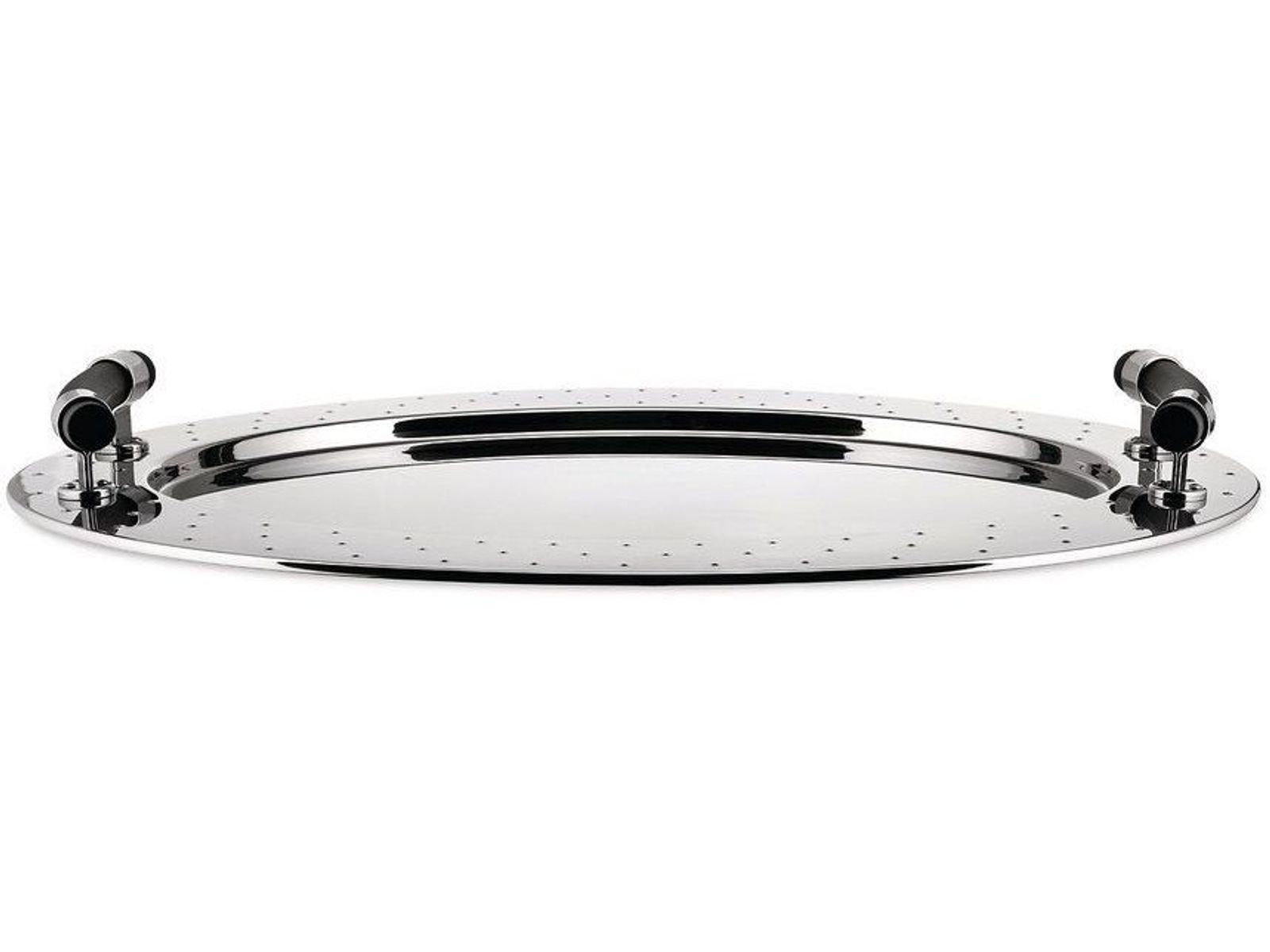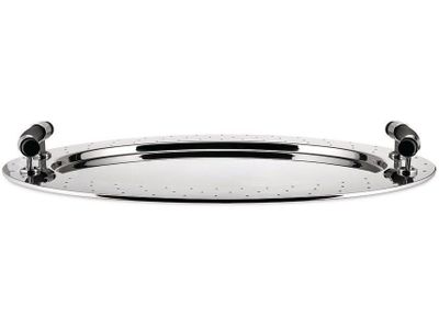 Ovale schaal van 18/10 roestvrij staal met handgrepen in thermoplastische hars, zwart.